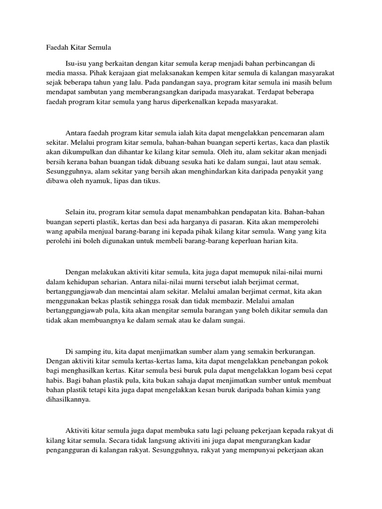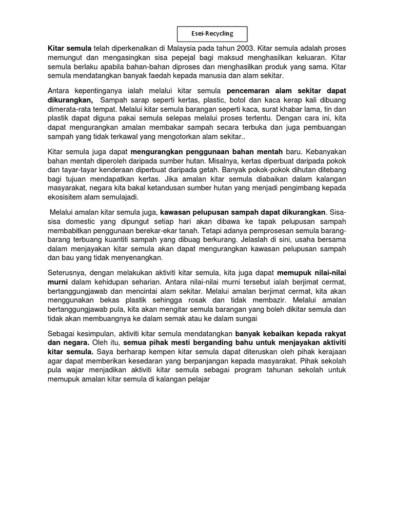 . Web Anda boleh menggunakan contoh karangan di bawah sebagai panduan untuk membantu dalam penulisan karangan Bahasa Melayu. Web Izharnya amalan kitar semula dapat membantu manusia untuk menjimatkan sebahagian sumber kewangan yang digunakan untuk mengurus bahan buangan dan disalurkan ke arah yang lebih bermanfaat. Pertumbuhan ekonomi dan bilangan.